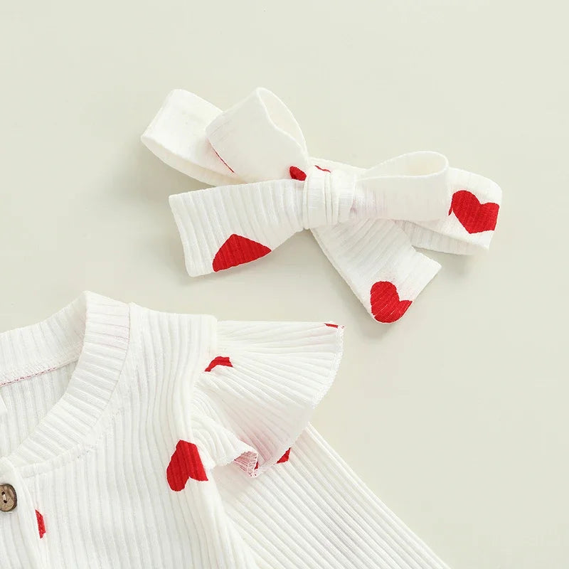 Adorable combinaison pour bébé fille avec imprimé cœur, manches volantées, col rond et boutons pratiques. Livrée avec bandeau assorti, confortable et légère pour nouveau-nés de 0 à 18 mois.