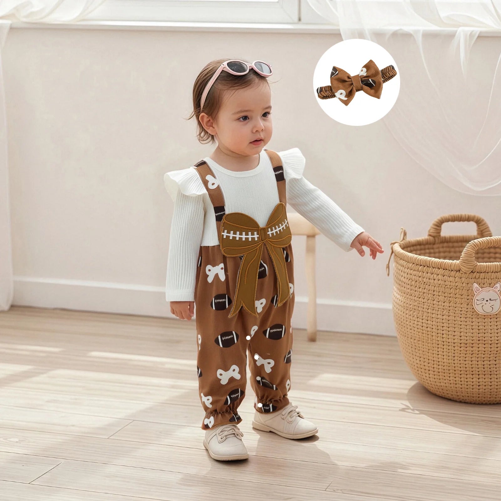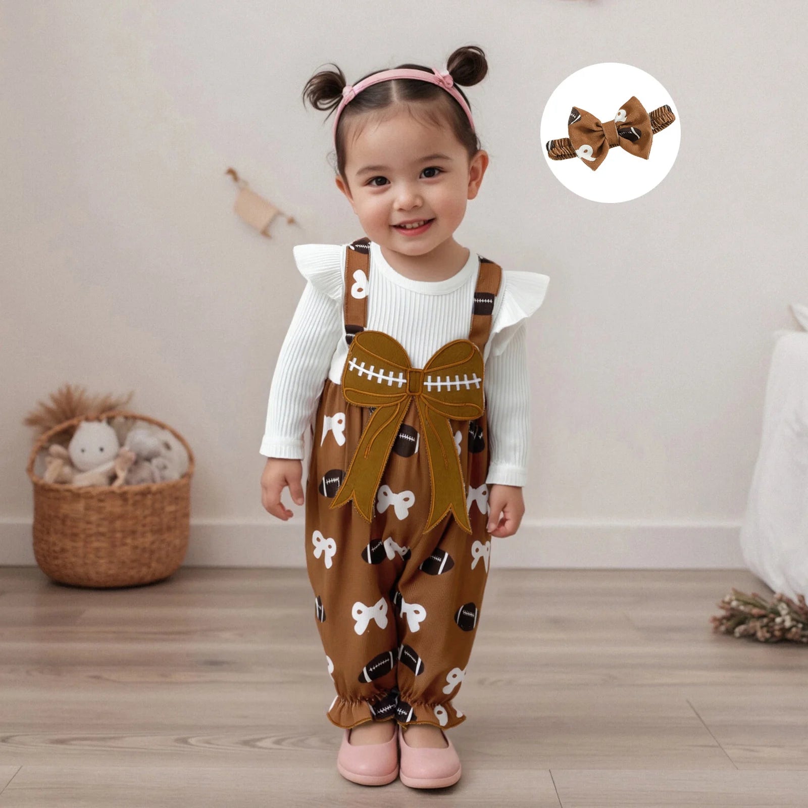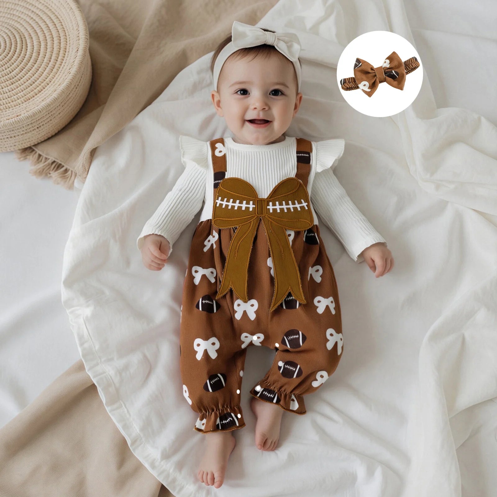 Adorable combinaison automne pour bébé fille avec imprimé football et nœud, manches longues et effet deux pièces. Livrée avec bandeau assorti, confortable et pratique pour les nouveau-nés de 1 à 12 mois.
