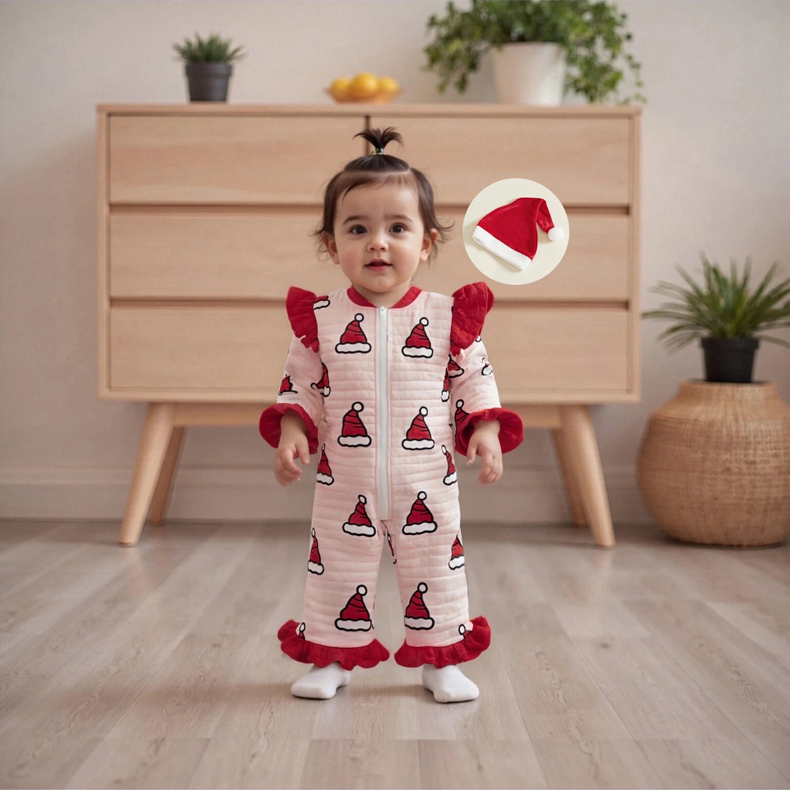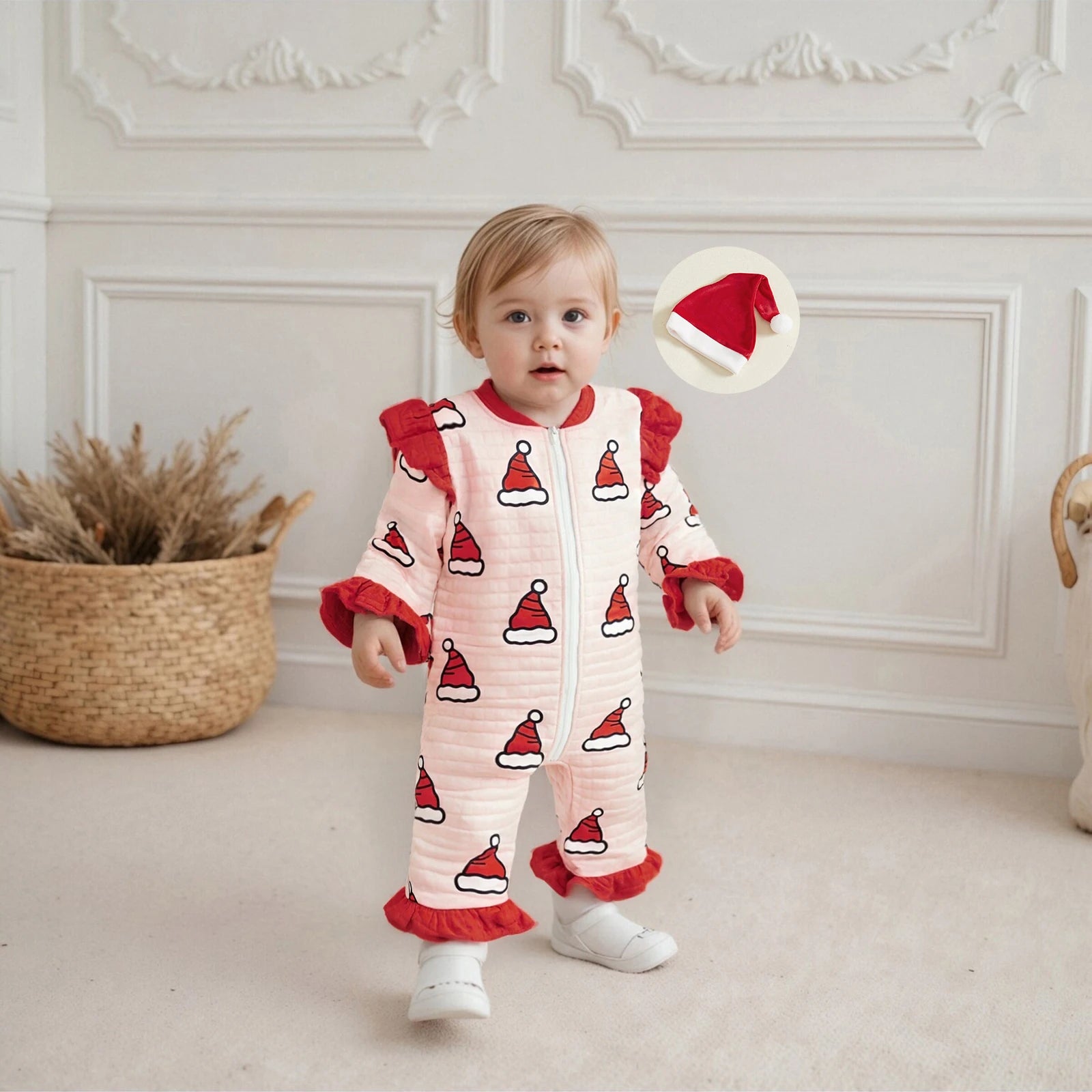 Adorable combinaison pour bébé fille avec imprimé bonnet de Père Noël, manches longues et fermeture éclair. Livrée avec chapeau assorti, confortable et chaude pour les nouveau-nés de 0 à 24 mois, parfaite pour l’hiver et les fêtes de Noël.
