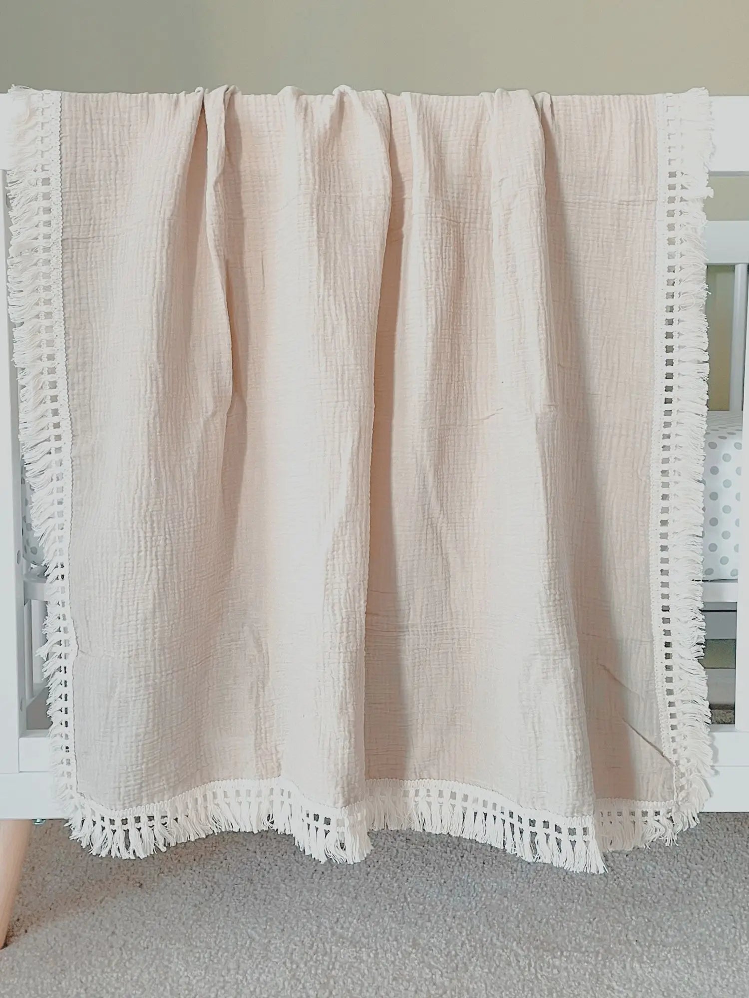 Couverture en mousseline de coton douce pour nouveau-nés avec pompons décoratifs.