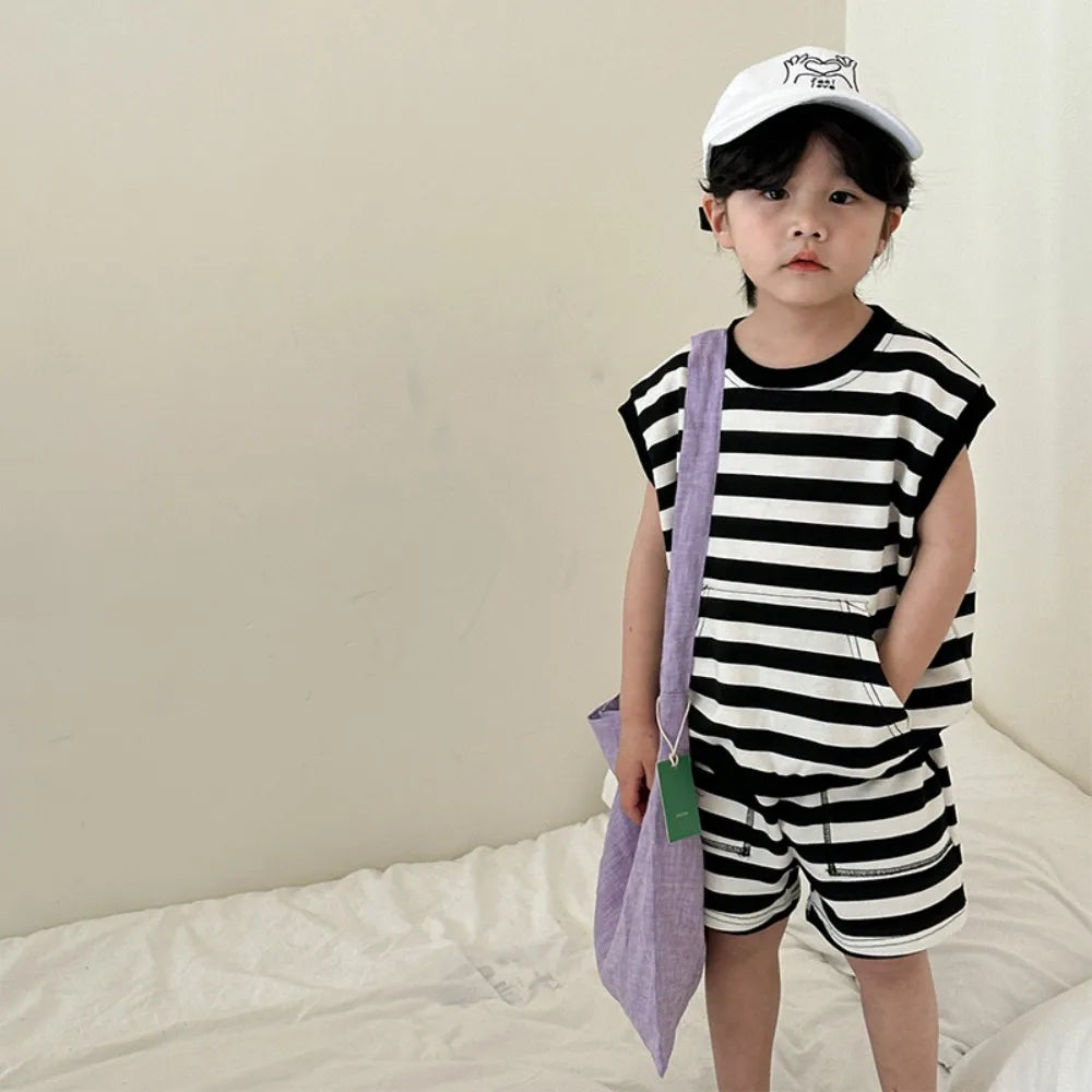 Ensemble pour bébés garçons et filles comprenant débardeur à col rond sans manches avec motifs rayés et pois et short assorti, léger et confortable.