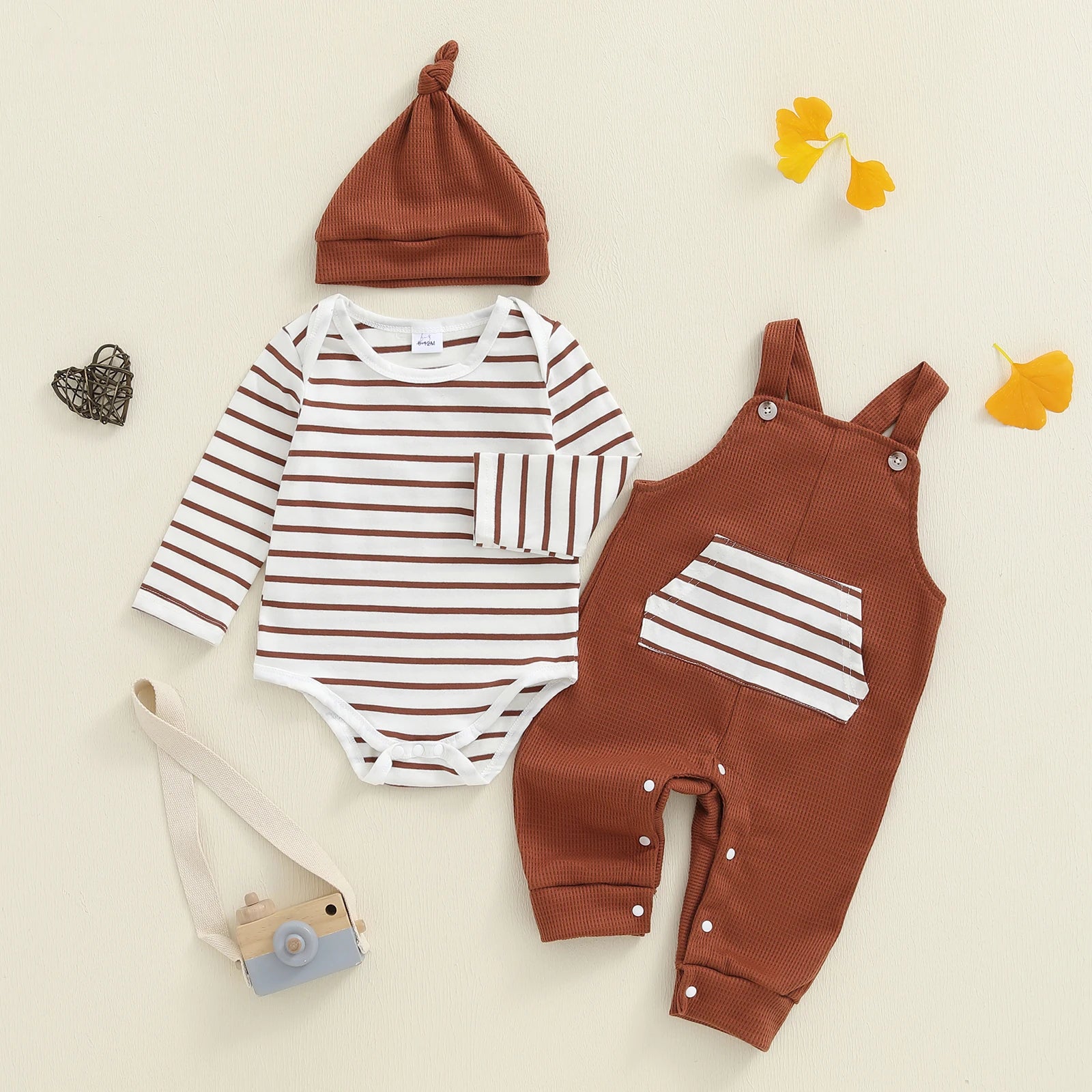Ensemble 3 pièces pour nouveau-né comprenant romper à manches longues, pantalon et bonnet assorti.