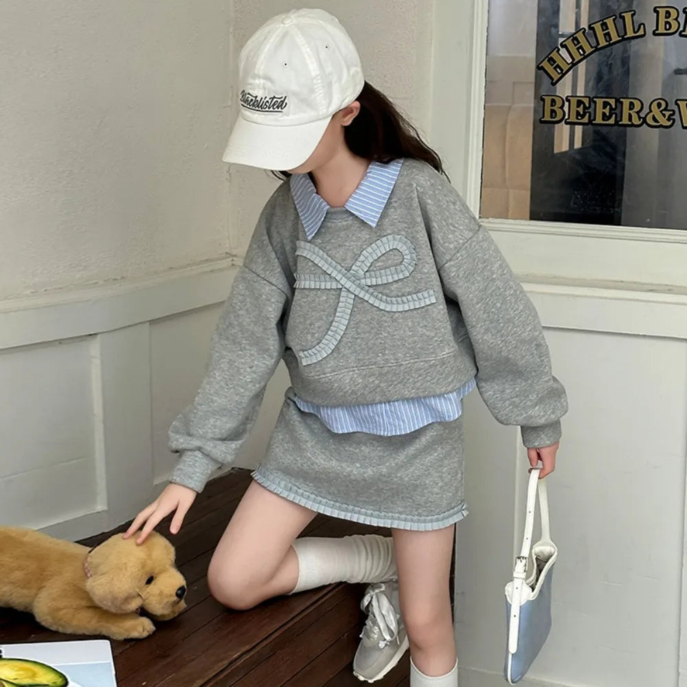Ensemble pour adolescentes comprenant haut manches longues avec nœud et jupe-short assortie, style street tendance et confortable.