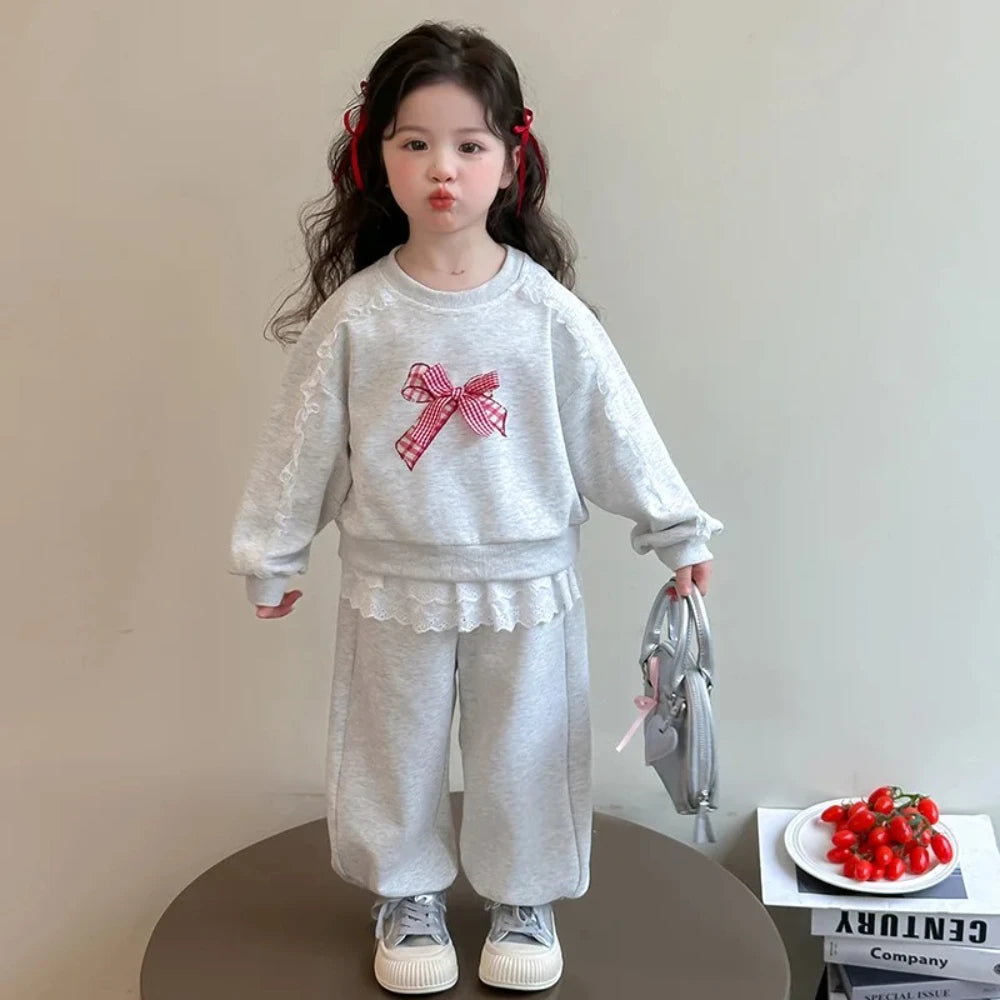 Ensemble pour filles comprenant haut à manches longues avec nœud et dentelle + pantalon assorti, couleur unie confortable et tendance.