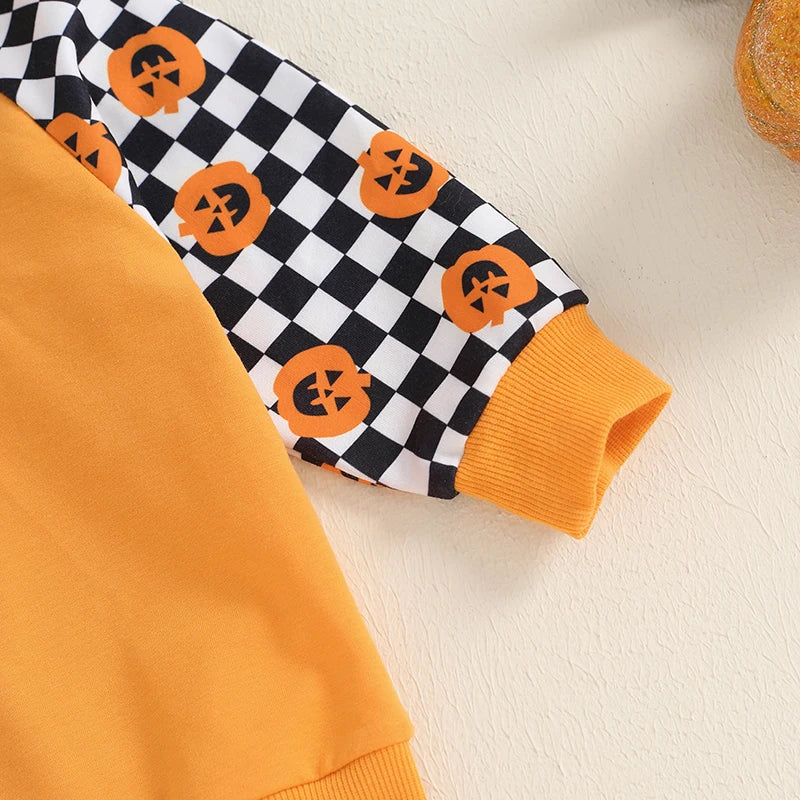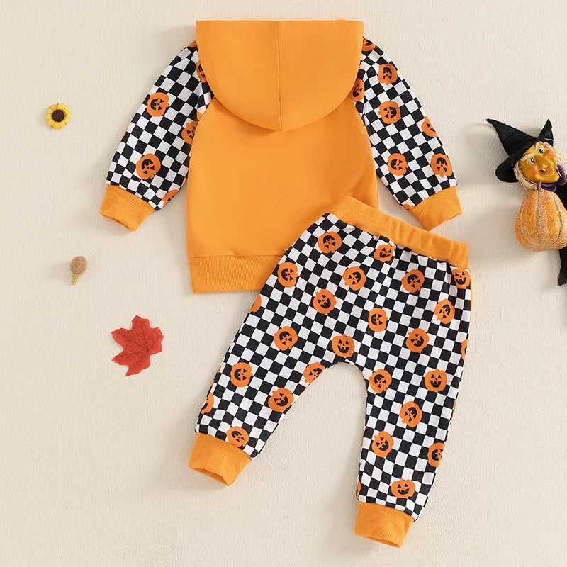 Ensemble 2 pièces pour bébé garçon avec sweat à capuche imprimé fantôme et citrouille et pantalon à taille élastique.