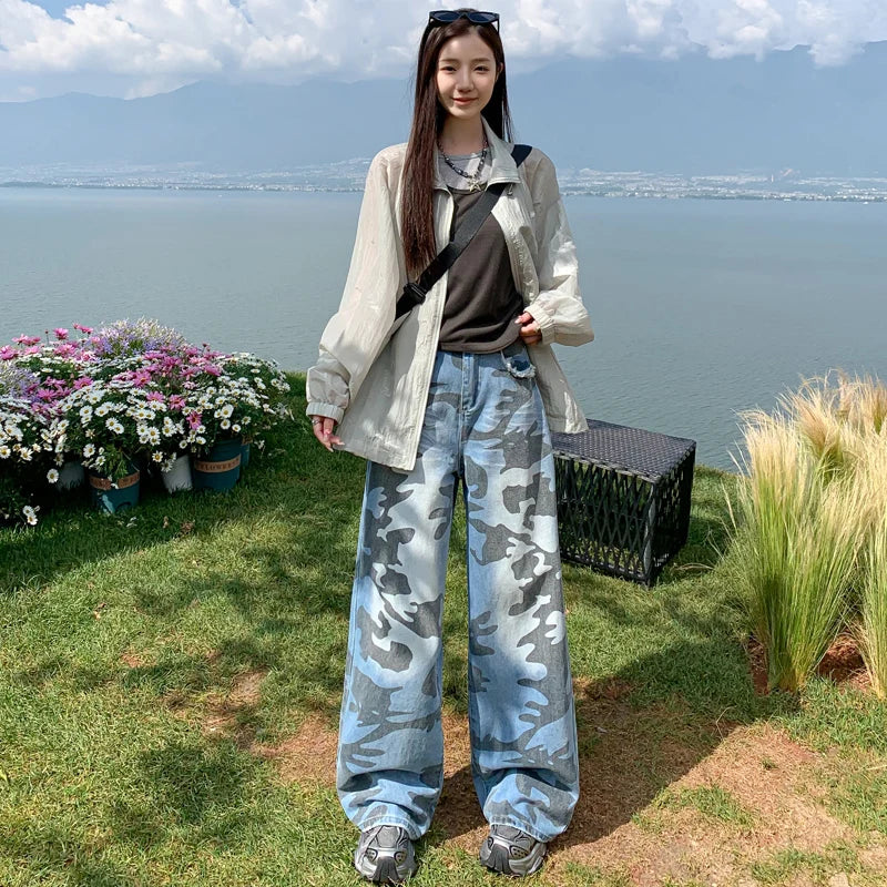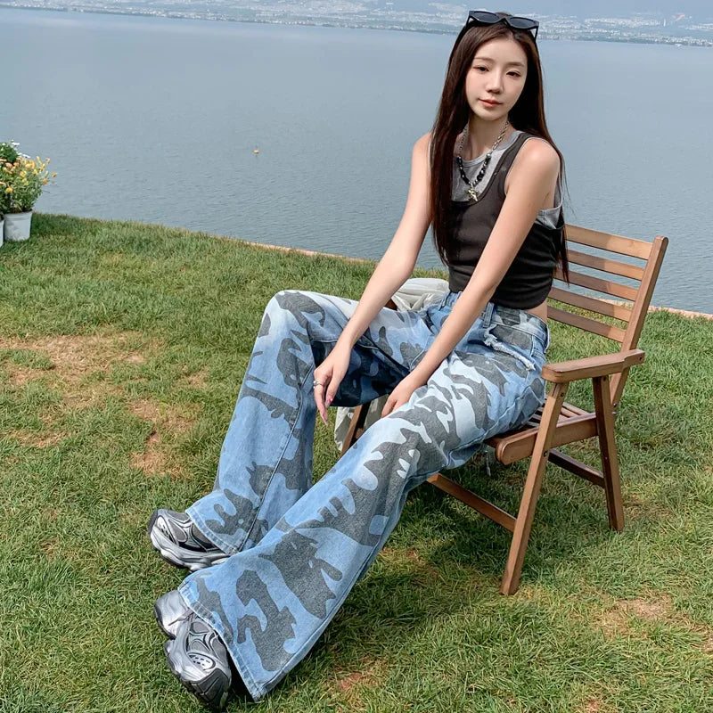 Pantalon en jean droit et décontracté pour femme, avec imprimé camouflage tendance.