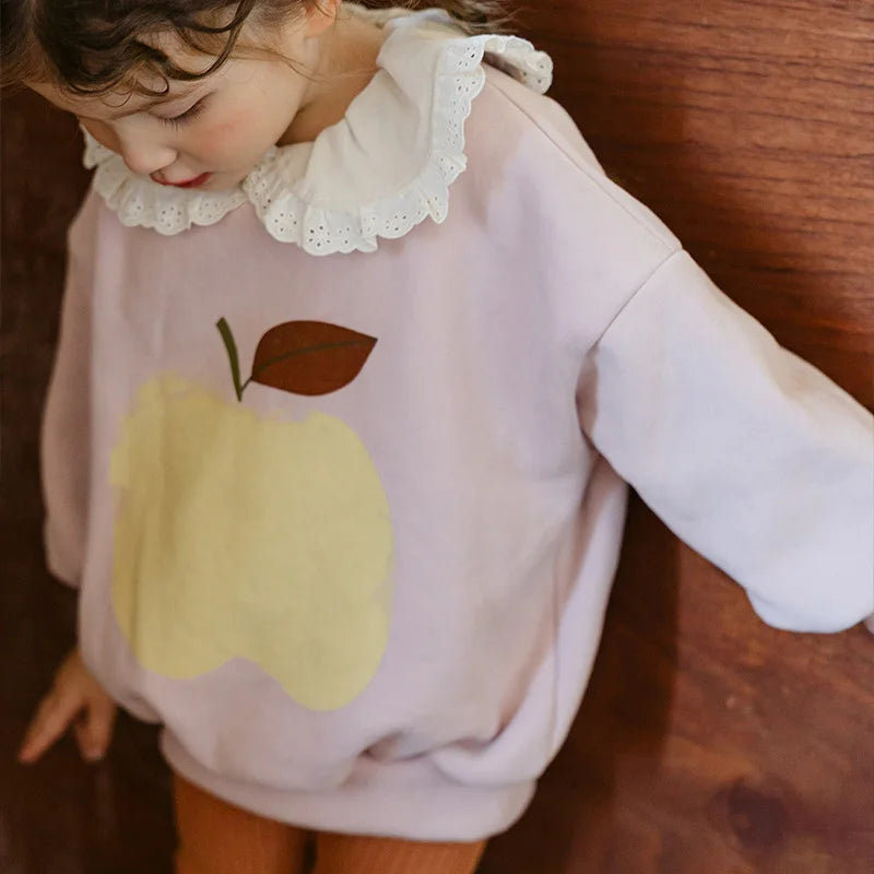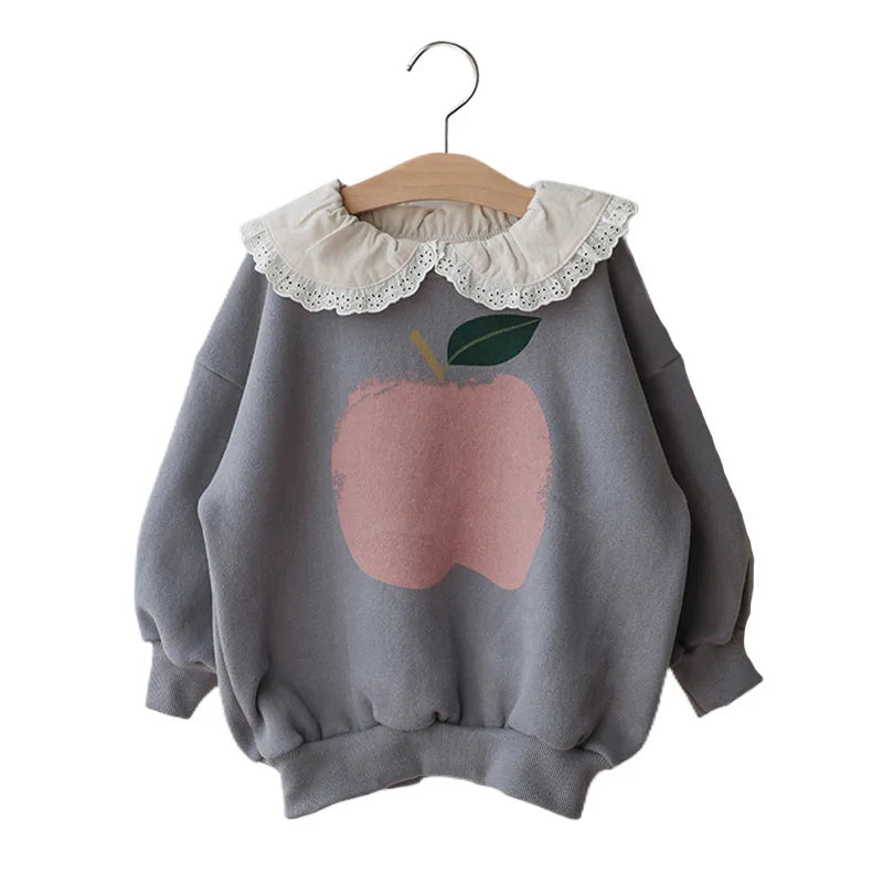Pull pour bébés filles en coton doux avec col à revers et motif pomme, doublure polaire confortable pour l’hiver.