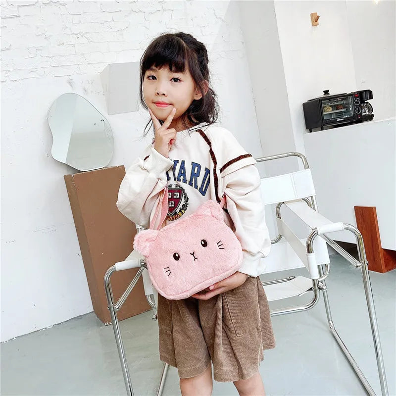 Sac bandoulière en peluche avec motif chat cartoon, doux et adorable pour filles et garçons.