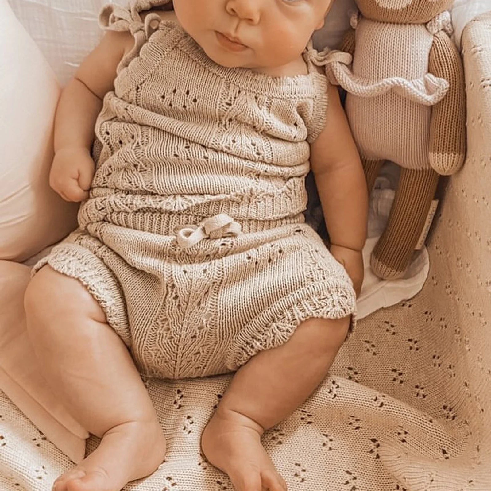 Ensemble short et romper en tricot doux pour bébés garçons et filles, facile à enfiler grâce au cordon réglable.