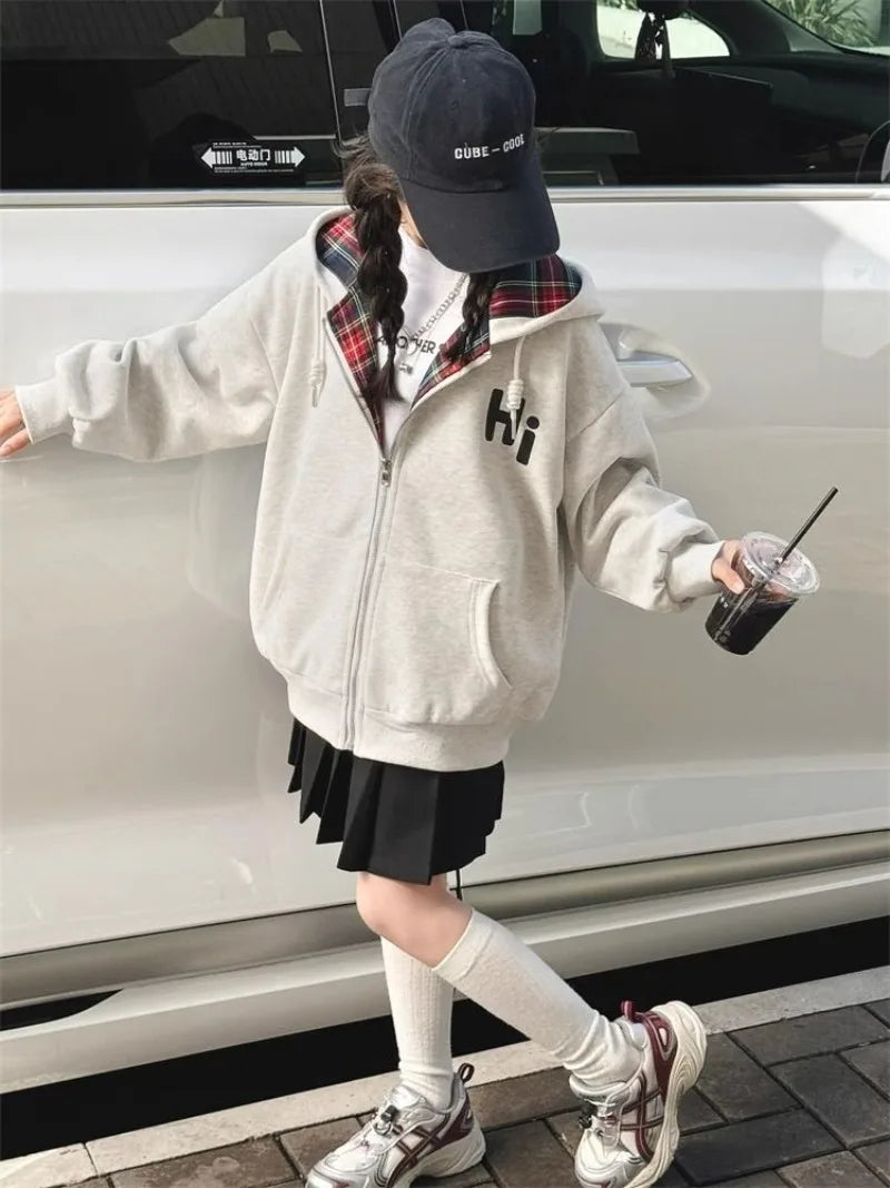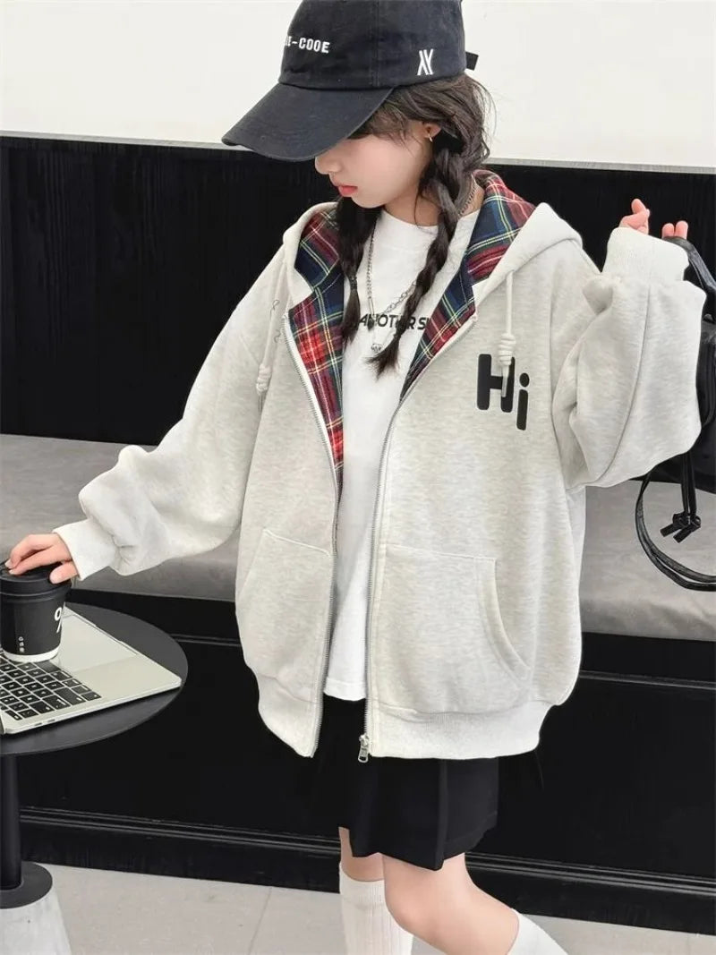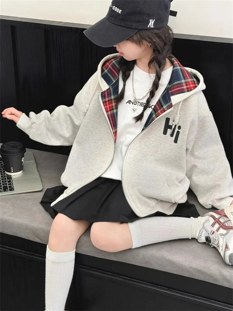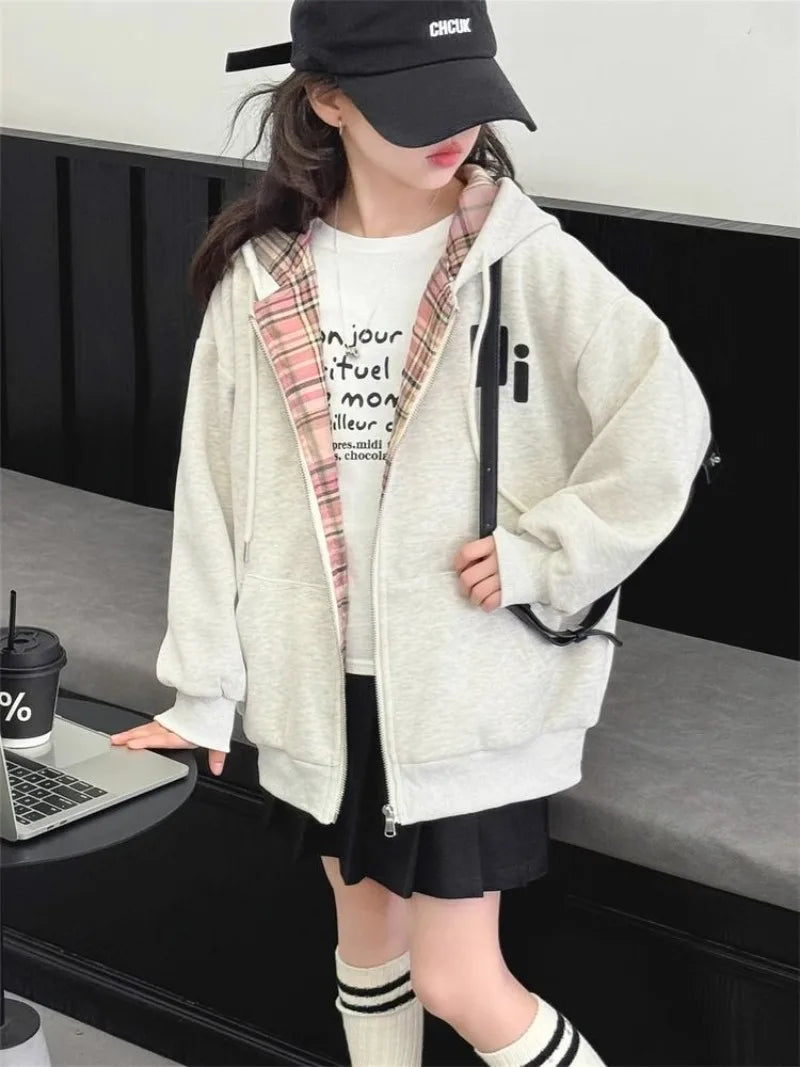 Sweat à capuche coréen pour le printemps et l’été, motif à carreaux tendance et coupe confortable.