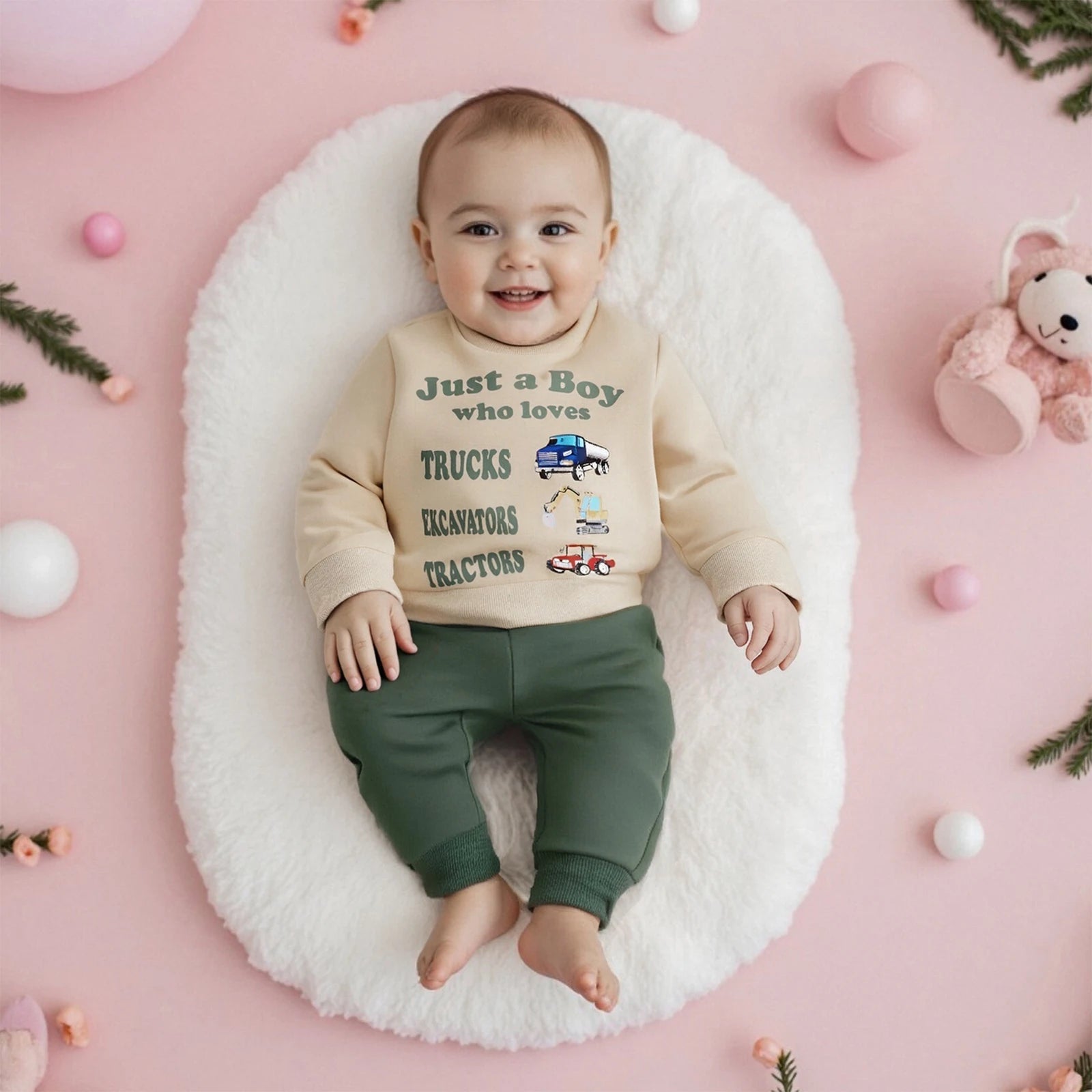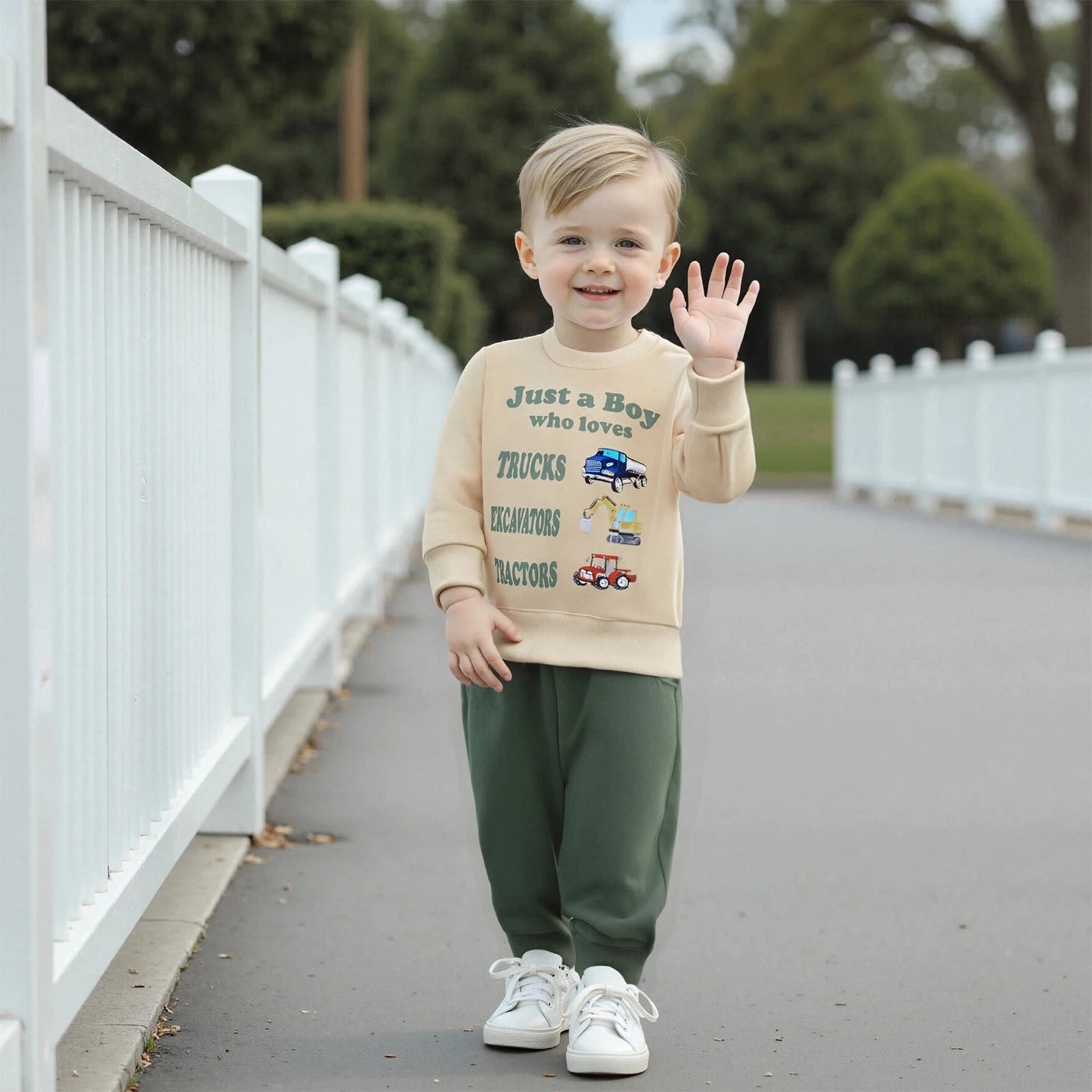 Ensemble automne pour garçon comprenant sweat-shirt à manches longues imprimé lettres et véhicules et pantalon à taille élastique.
