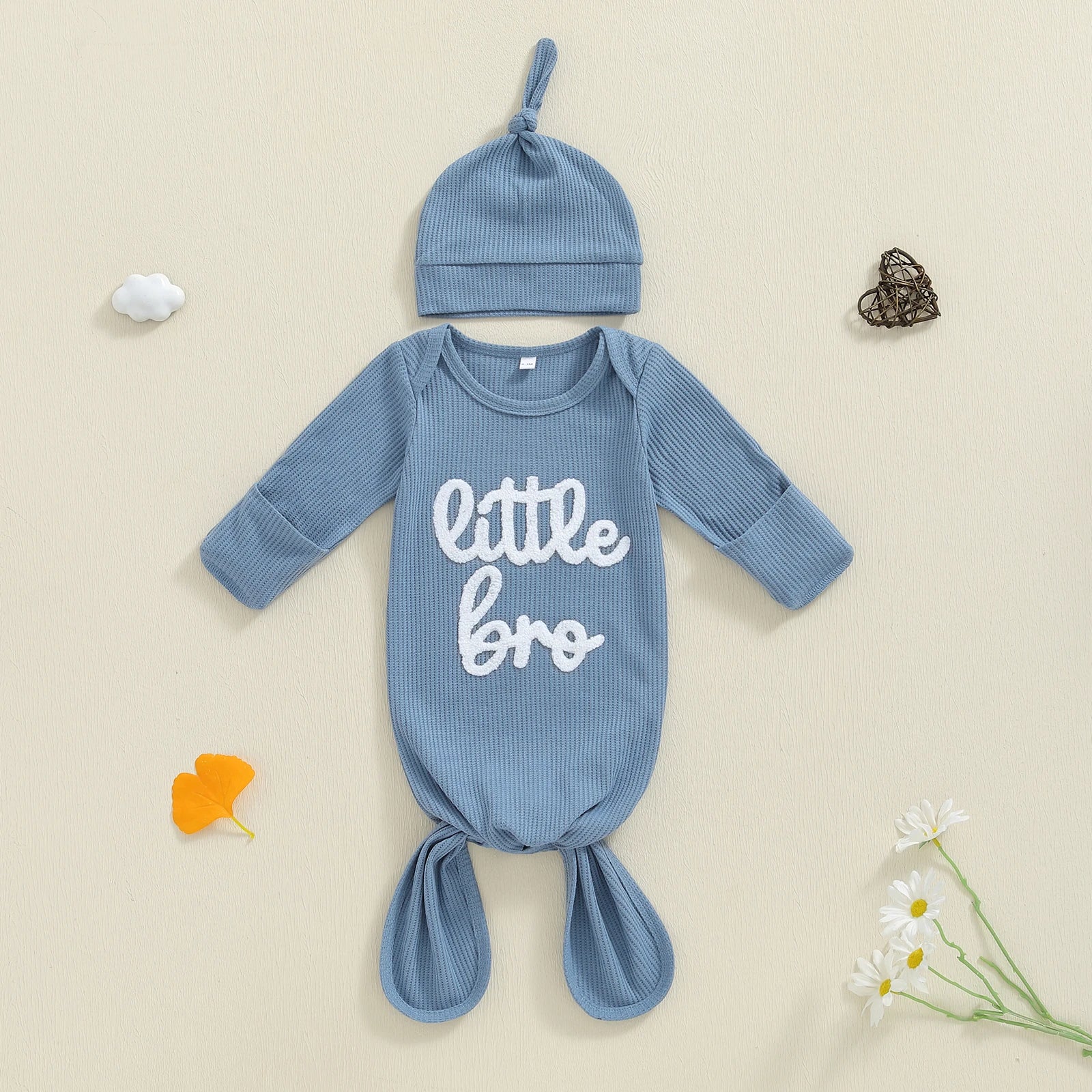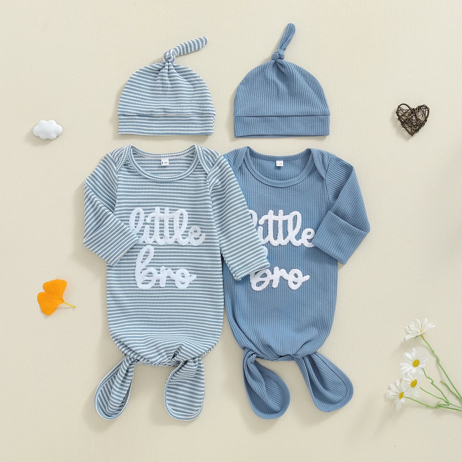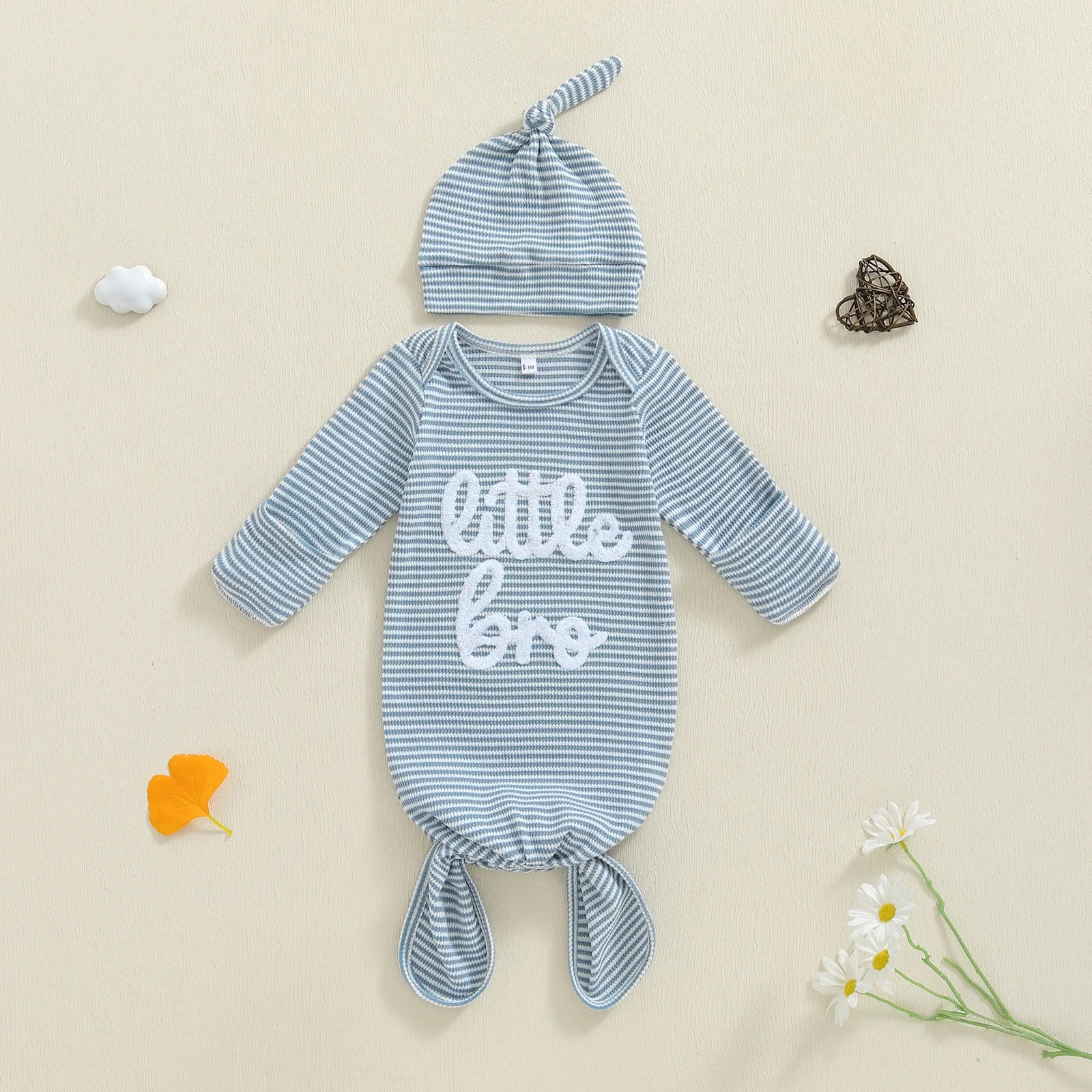 Ensemble pour bébé garçon nouveau-né comprenant gigoteuse à nœud et bonnet assorti.